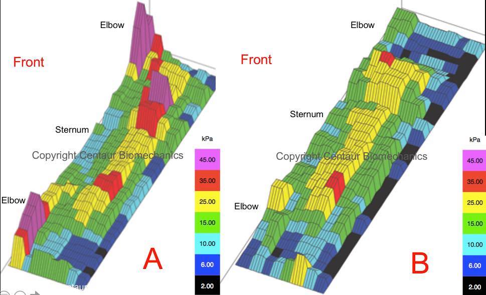 Previously it has been assumed that the highest pressures beneath the girth are localised to the sternum. From a study we did before the London 2012 Olympics, using an electronic pressure mat positioned beneath the girth combined with motion capture, we quantified the effect that girth fit and design has on grith pressures and locomotion (1). In that study we demonstrated that, contrary to popular belief, areas of high pressures were localised behind the elbow and not on the sternum.