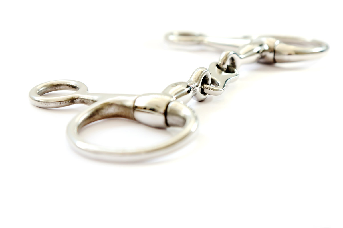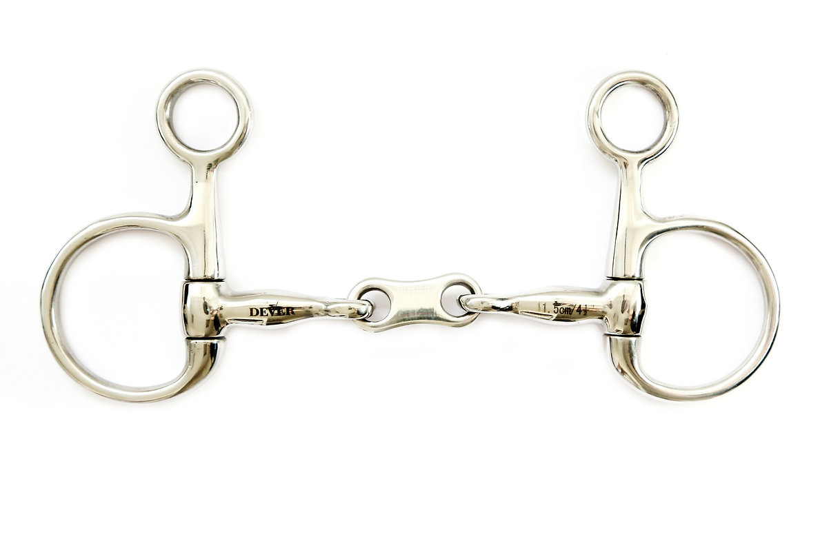This Hanging Cheek Snaffle with French Link is also known as a Filet Baucher French Link snaffle. It creates pressure on the poll, as the cheek piece has an extra ring above the snaffle ring where the bridle cheek pieces are attached. Esta presión en la nuca anima al caballo a bajar la cabeza y acercarse al bocado, especialmente útil para caballos que tienen un porte de cabeza alto..