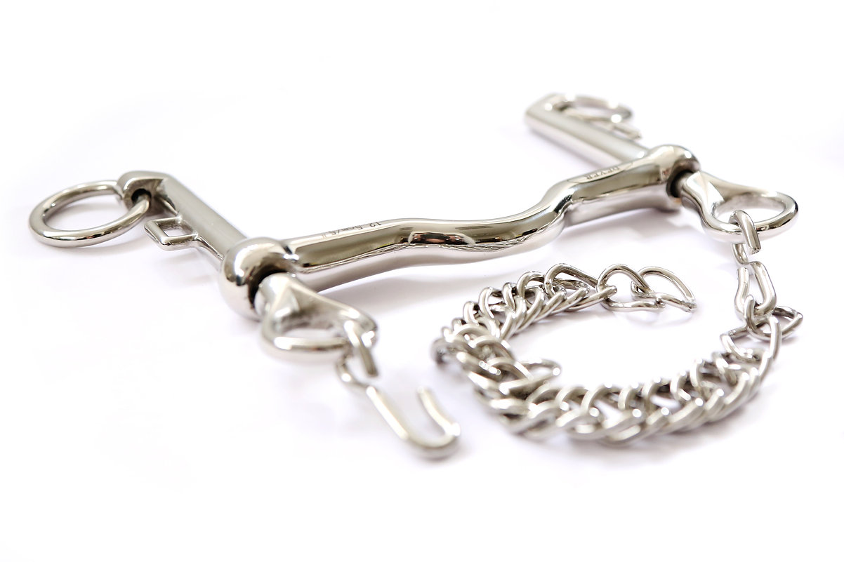 Weymouth Sliding Cheek bits are used in double bridles. It combines the action of the curb and snaffle, aplicando presión en la nuca, así como en las barras de la boca y la lengua. The curb chain (incluido) presses on the chin groove.