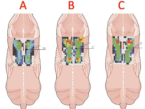 (Images A: Correct fit – uniformed pressure; B= saddle which is too narrow – 4 points of pressure; C= saddle which is too wide – localised pressures at the front)
